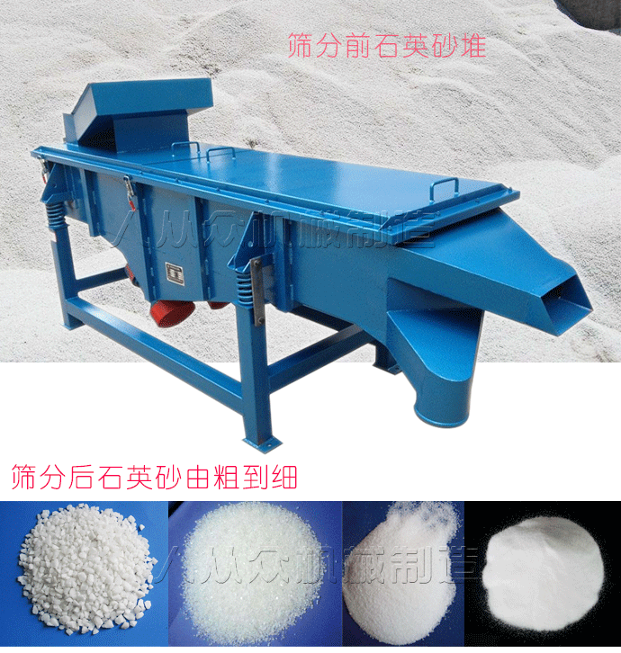 石英砂(shā)直(zhí)線篩(shāi)在振動電機的帶動下,石英砂跟隨著產(chǎn)生的直線推動力做(zuò)向(xiàng)前的直線跳(tiào)躍運(yùn)動,顆粒小的會通過篩網落下(xià)去完成分級或者進入下一次分級。