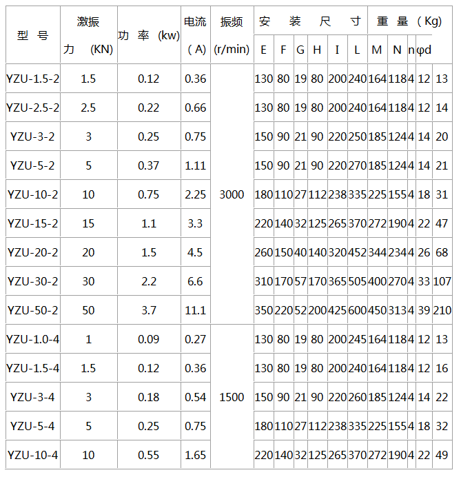 YZU振動電(diàn)機型號(hào)有(yǒu)很多種,如:YZU-1.5-2、YZU-2.5-2、YZU-3-2、YZU-5-2、YZU-10-2、YZU-15-2、YZU-20-2、YZU-30-2、YZU-50-2等(děng)。